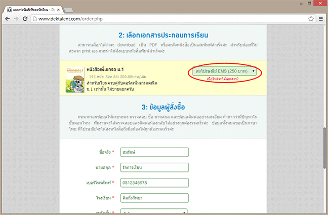 1.5 เลือกเอกสารประกอบการเรียนครับ สำหรับคอร์สเรียนทุกคอร์ส (ยกเว้นคอร์สเฉลยข้อสอบ) มีเอกสารประกอบการเรียนให้ download ฟรีครับ หรือถ้าต้องการสั่งซื้อเป็นหนังสือก็สามารถสั่งได้ เป็นเวอร์ชันเดียวกันกับชีทครับ แต่พิมพ์เข้าเล่มสำเร็จแล้ว สวยงามน่าเรียน เลือกส่งได้สองแบบคือ แบบลงทะเบียน (ฟรี) ที่ใช้เวลาส่ง 2-3 วันทำการในกรุงเทพ หรือ 3-4 วันทำการในต่างจังหวัด หรือถ้าต้องการส่งด่วนก็ให้เลือกแบบ EMS (เพิ่มอีก 50 บาท) ซึ่งจะใช้เวลา 1-2 วันทำการทั่วประเทศครับ