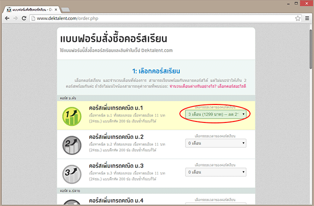 1.4 เลือกคอร์สเรียนที่ต้องการ และเลือกจำนวนเดือนที่ต้องการ โดยการคลิ๊กเลือกจำนวนเดือนครับ ในตัวอย่างพี่เลือก คอร์สเพิ่มเกรดคณิต ม.1 และระยะเวลา 3 เดือน ถ้าสั่งซื้อทีเดียวยาวๆมีส่วนลดให้ด้วยนะครับ ถูกกว่ามาซื้อทีละเดือนเยอะเลย คุ้มกว่าครับ ในขั้นตอนนี้ถ้ายังไม่ทราบว่าคอร์สเรียนและจำนวนเดือนคืออะไร ให้อ่านที่นี่ครับ