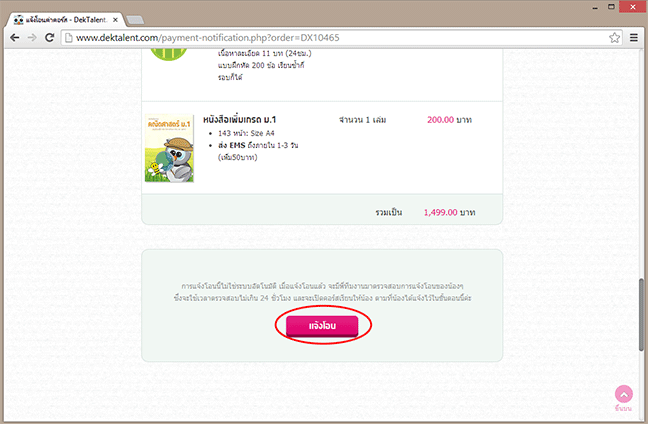 3.2 ในหน้านี้จะแสดงรายการสั่งซื้อทั้งหมดของเรา ดูจากหมายเลขสั่งซื้อที่จดไปในขั้นตอนแรกนะครับ ตรวจสอบรายละเอียดว่าคอร์สเรียน หนังสือ และราคาตรงนะ แล้วก็คลิ๊กแจ้งโอนเลย