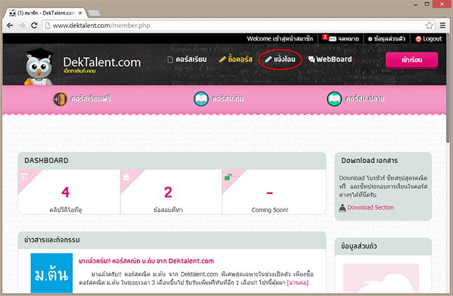 ให้น้อง Login แล้วดูด้านบนสุดของหน้าเว็ปมีแถบดำๆ จะมีชื่อตัวเองอยู่ ให้คลิ๊กที่นี่เพื่อเข้าสู่หน้าสมาชิกครับ ในหน้าสมาชิกจะมีรายละเอียดคอร์สเรียนของตัวเอง เข้าเรียนจากตรงนี้ได้ครับ หรือในอีกช่องทางนึงคือคลิ๊กเข้าไปที่หน้าคอร์สเรียนจากหน้าแรกของเว็ปก็ได้ครับ เข้าได้เหมือนกันทั้งสองช่องทาง