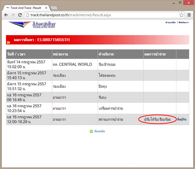 ระบบตรวจสอบของไปรษณีย์มักมีการล่าช้า ในบางครั้งส่งของถึงมือแล้วแต่บนเว็บก็ยังบอกว่าเดินทางยังไม่ถึงจังหวัดของน้องเลย อย่าตกใจไปนะครับ ในกรณีที่มีผู้อื่นรับหนังสือแทน น้องสามารถเช็คชื่อของผู้รับได้โดยการคลิ๊กที่ ชื่อผู้รับ