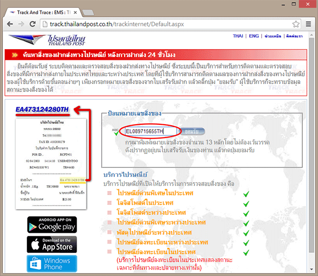 ใส่หมายเลข tracking number ลงไปในช่อง ป้อนหมายเลขสิ่งของ แล้วกด ยอมรับ